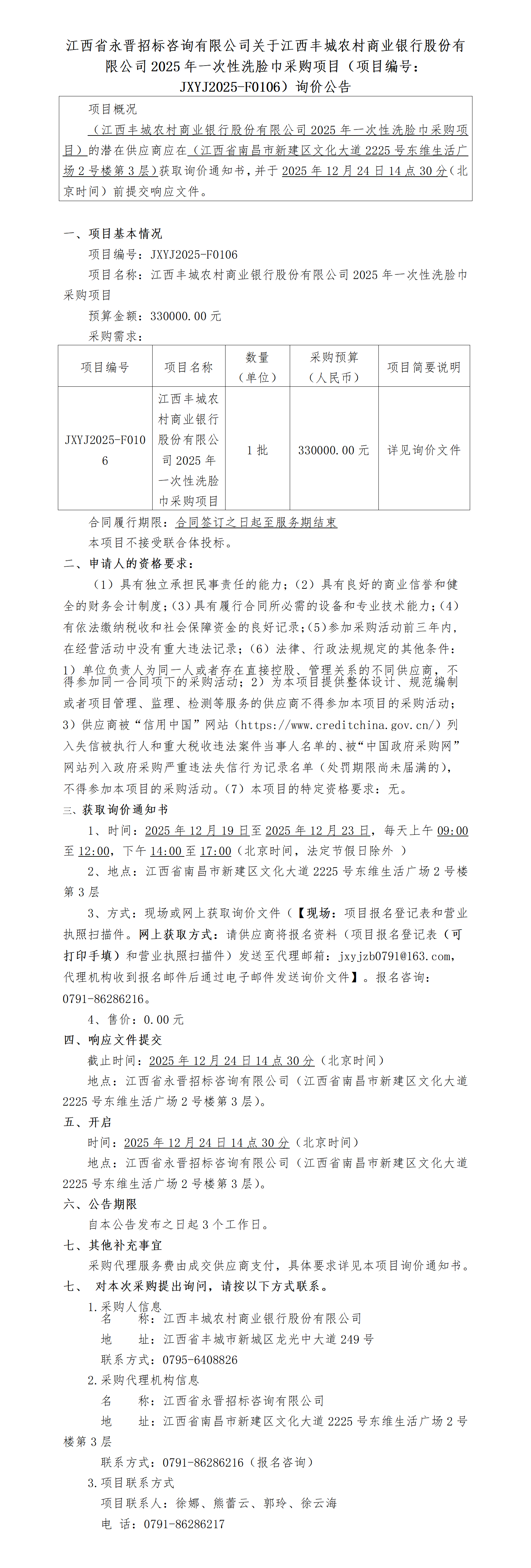 新葡的京集团35222vip关于江西丰城农村商业银行股份有限公司2025年一次性洗脸巾采购项目(项目编号:JXYJ2025-F0106)询价公告