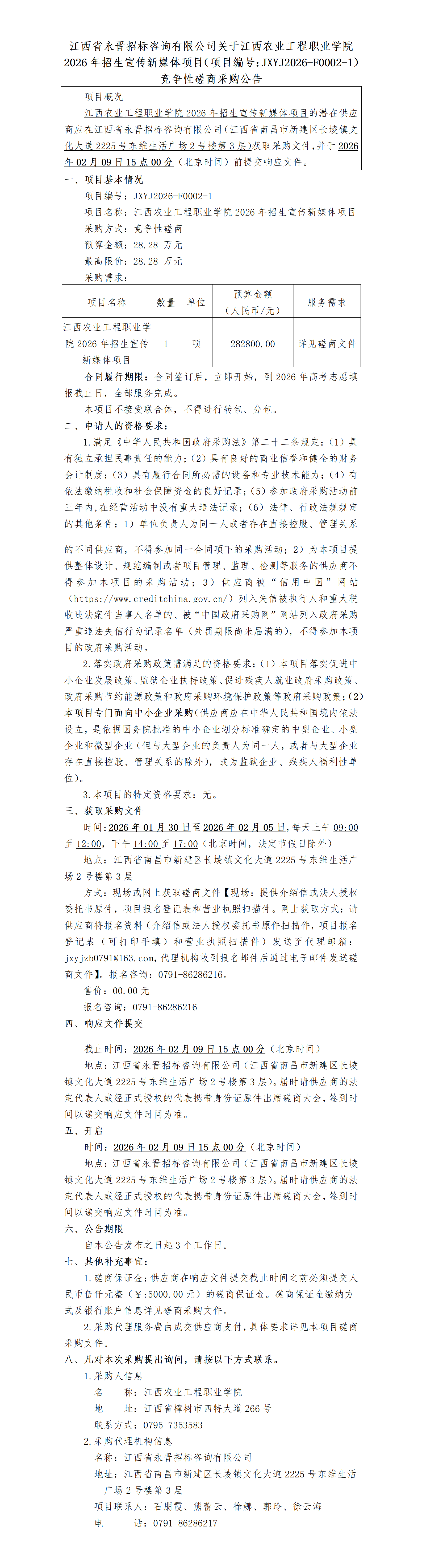 新葡的京集团35222vip关于江西农业工程职业学院2026年招生宣传新媒体项目(项目编号:JXYJ2026-F0002-1)竞争性磋商采购公告