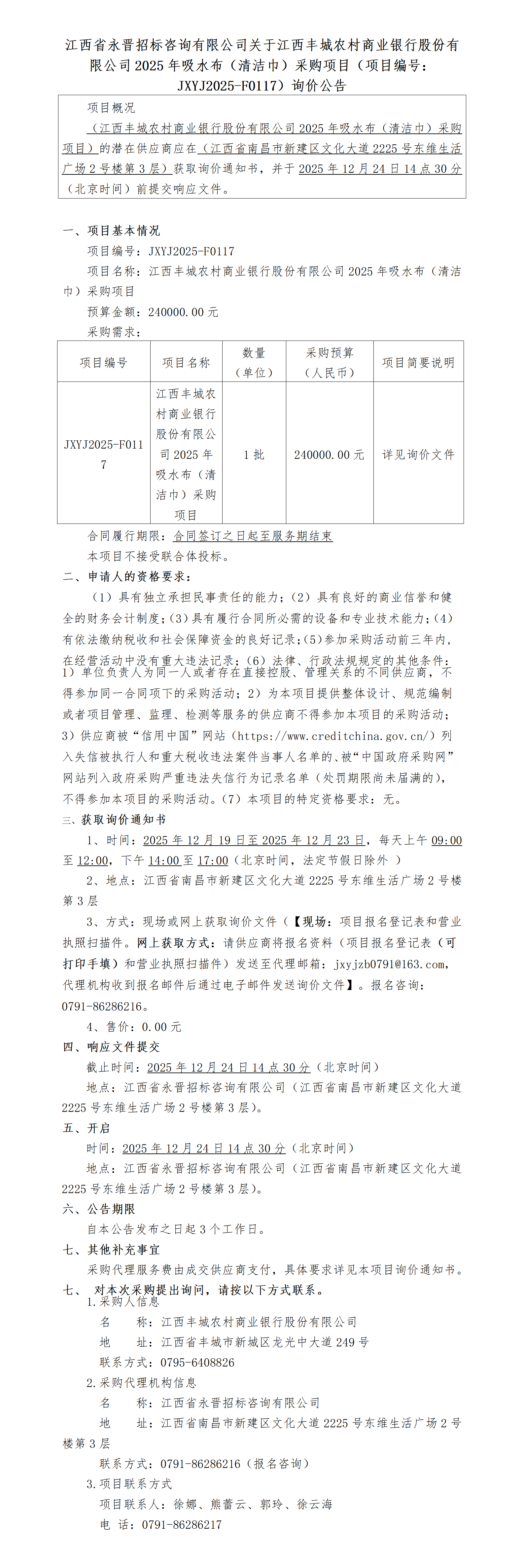 新葡的京集团35222vip关于江西丰城农村商业银行股份有限公司2025年吸水布(清洁巾)采购项目(项目编号:JXYJ2025-F0117)询价公告