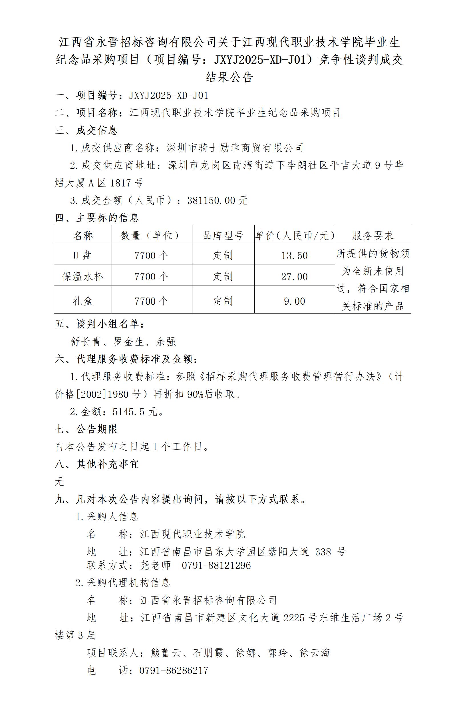 新葡的京集团35222vip关于江西现代职业技术学院毕业生纪念品采购项目(项目编号:JXYJ2025-XD-J01)竞争性谈判成交结果公告