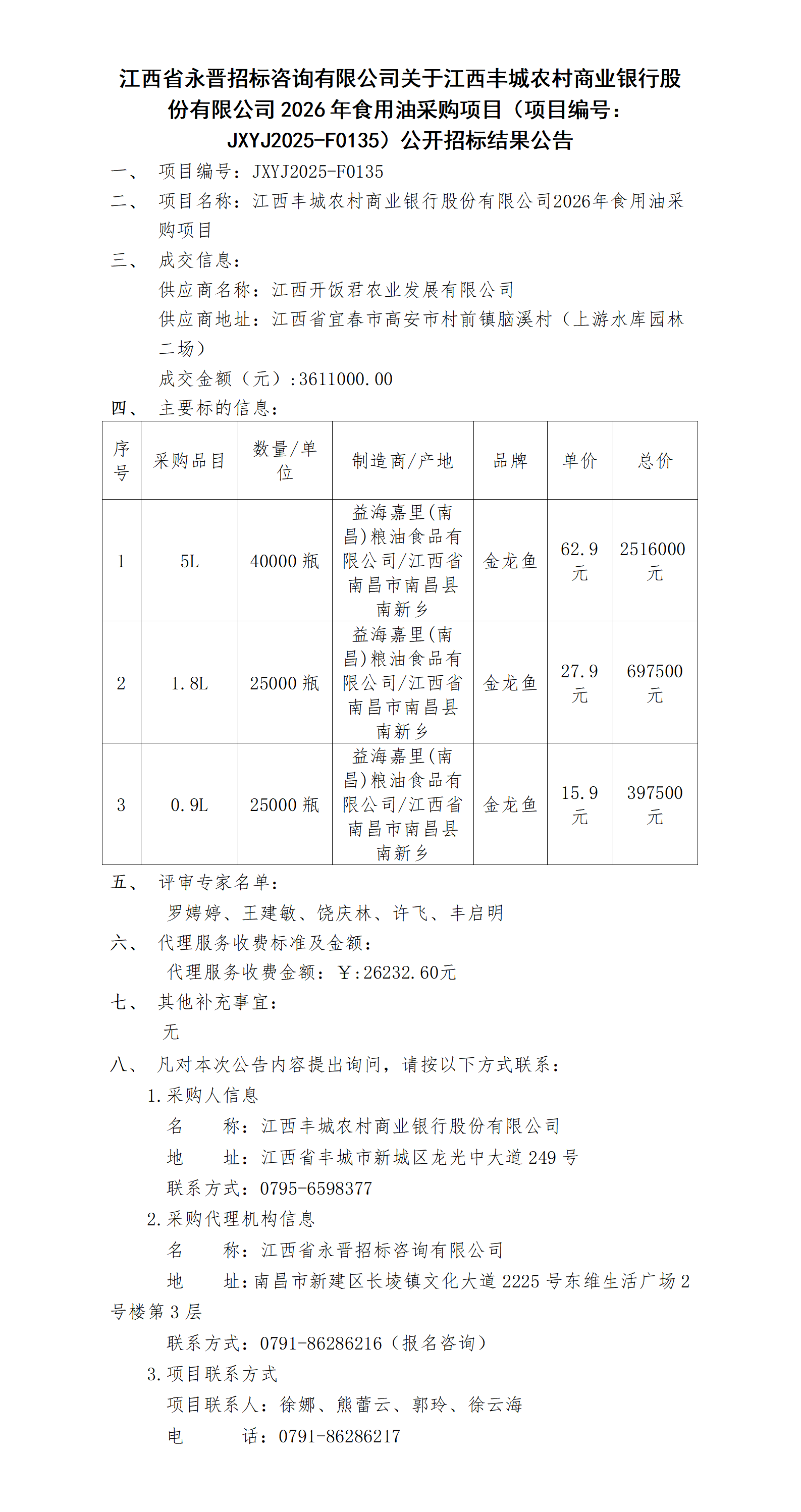 新葡的京集团35222vip关于江西丰城农村商业银行股份有限公司2026年食用油采购项目(项目编号:JXYJ2025-F0135)公开招标结果公告