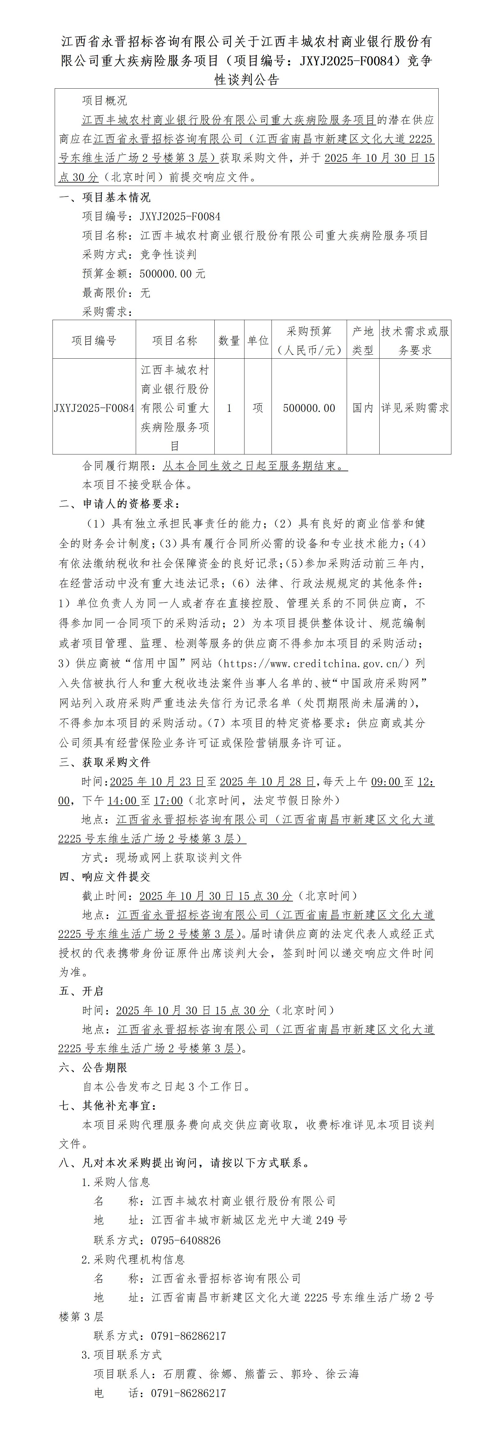 新葡的京集团35222vip关于江西丰城农村商业银行股份有限公司重大疾病险服务项目(项目编号:JXYJ2025-F0084)竞争性谈判公告